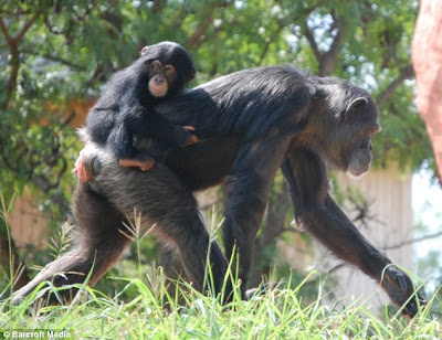 Giddy up mummy: Chimpanzee Ruben hitches a ride on his surrogate mum Kito's back in his new enclosure